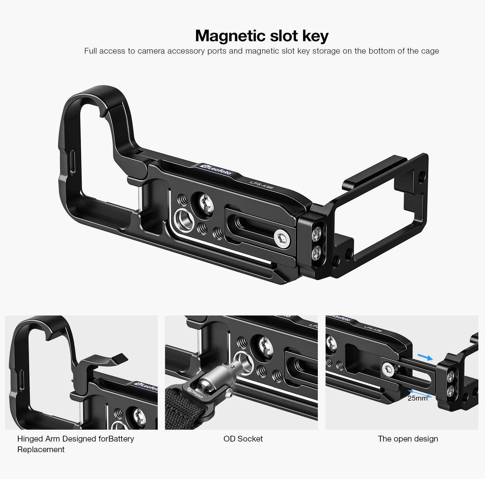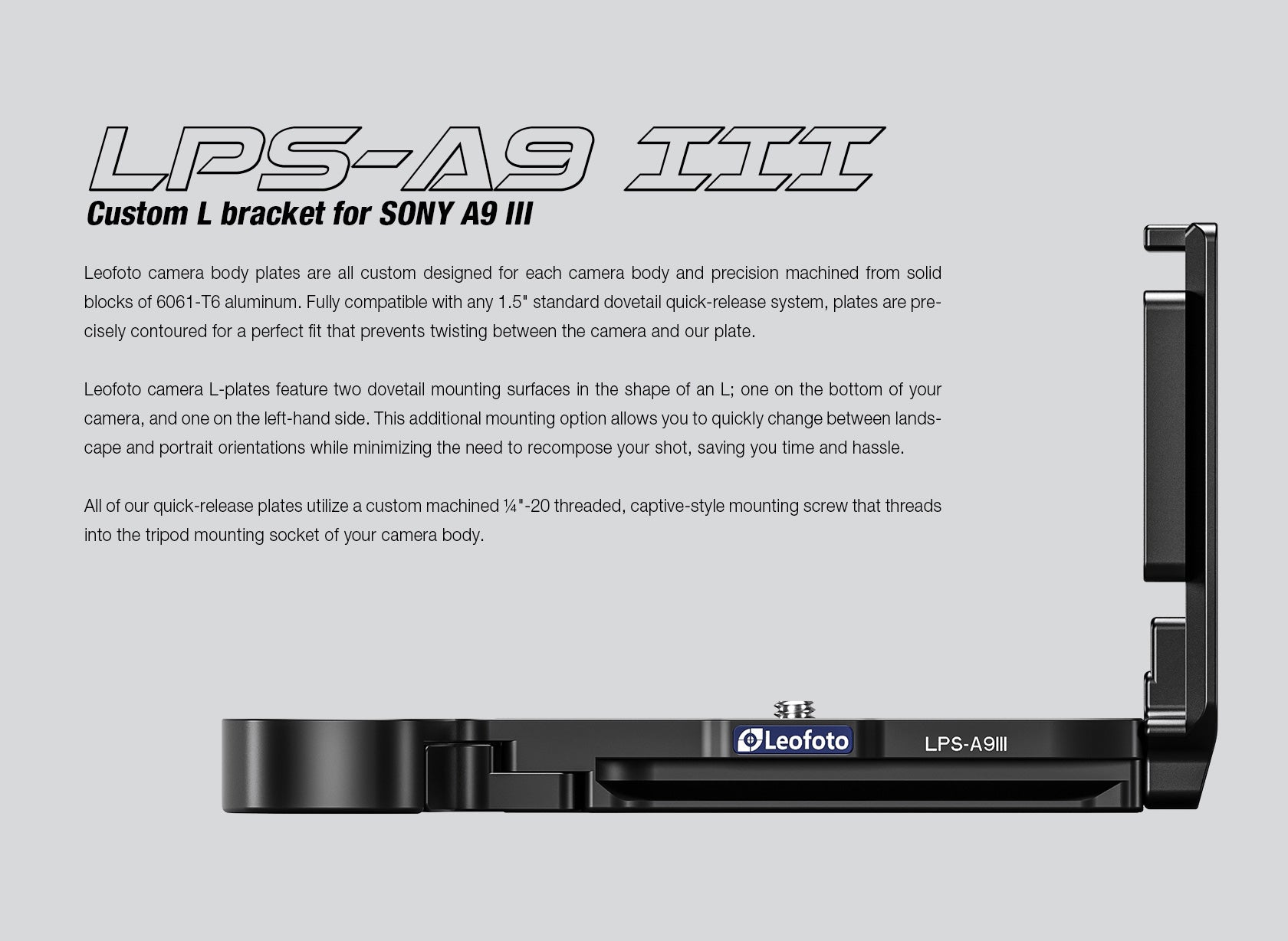 The Leofoto LPS-A9III L-bracket for Sony A9III is designed to wrap snugly around the bottom and left side of your camera without blocking access to the ports. One of the greatest accessories on the market, it allows quick and easy mounting of the camera in a landscape or portrait position. It also ensures that the camera isn't awkwardly hanging to one side of the tripod, risking potential disaster.